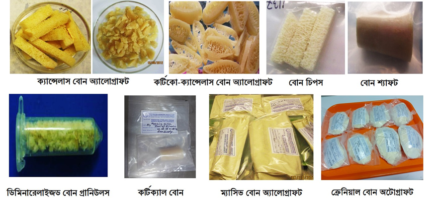 ফ্রিজড্রাইড টিপিক্যাল বোন চিপস, ডিমিনারেলাইজড বোন গ্রানিউলস, বোন শ্যাফট, বোন স্লাইস, ম্যাসিভ বোন ইত্যাদি অর্থোপেডিকস, স্পাইনাল ও ম্যাক্সিলোফেসিয়াল সার্জারিতে ব্যবহৃত হয়;